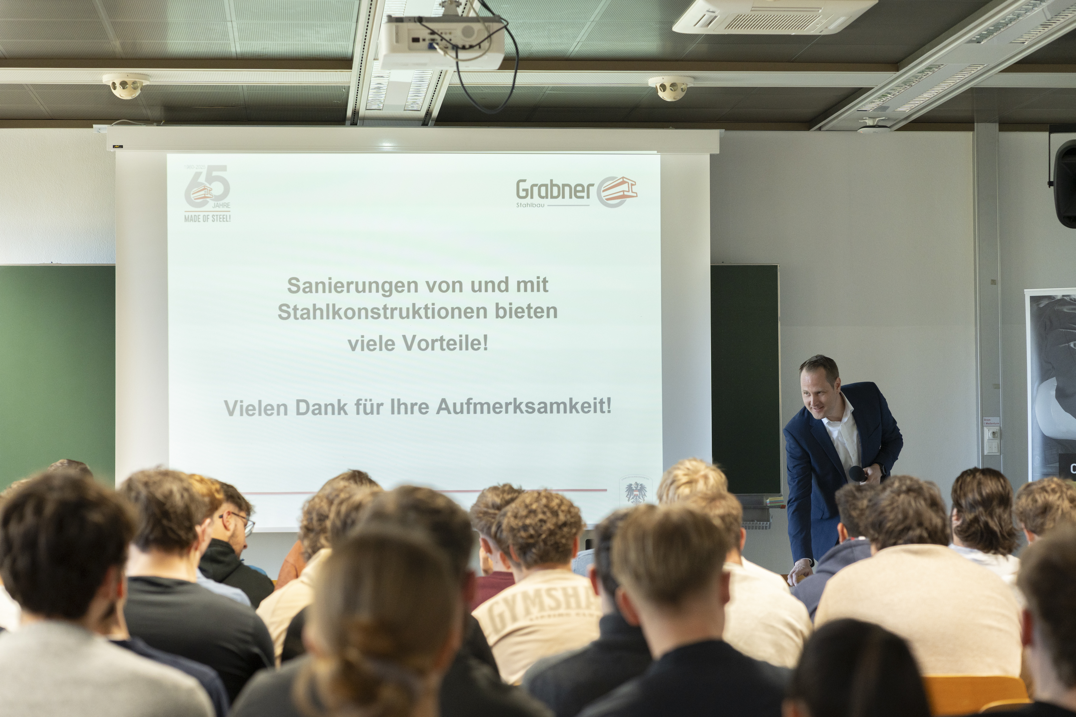 - Ing. Stefan Halwachs (Grabner Stahl & Maschinenbau GmbH) widmete sich dem Stahlbau im Zeichen der Kreislaufwirtschaft und veranschaulichte die Umsetzung anhand eines konkreten Stahlbauprojekts.