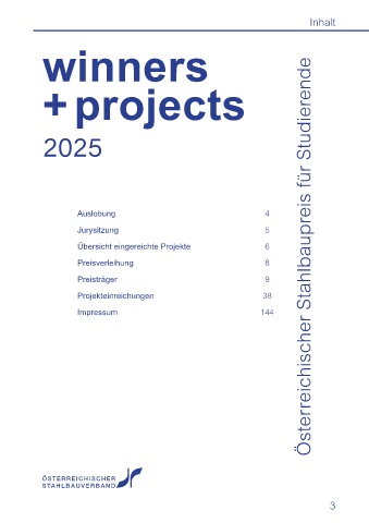 Inhalt winners + projects 2025 Auslobung 4 Jurysitzung 5 Übersicht eingereichte Projekte 6 Preisverleihung 8 Österreichischer Stahlbaupreis für Studierende Preisträger 9 Projekteinreichungen 38 Impressum 144 3